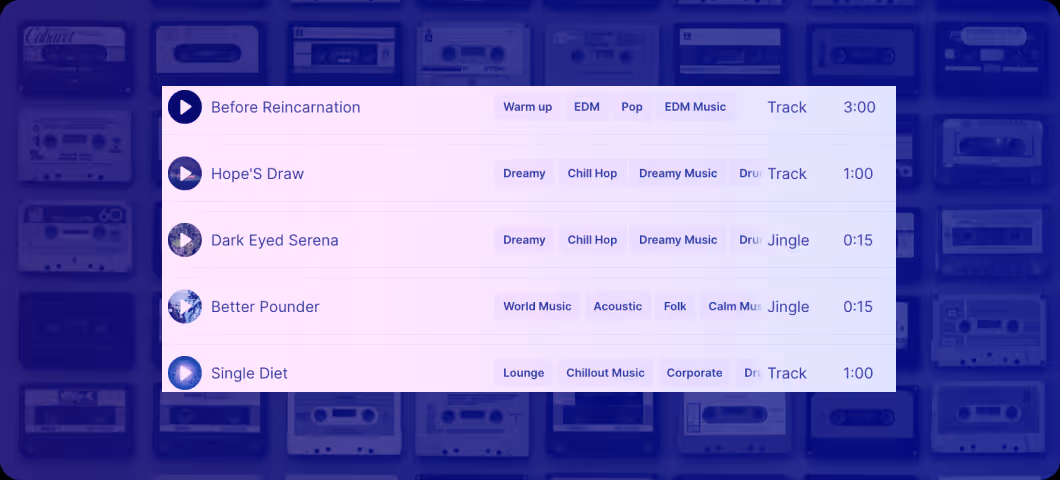A ready-made library of 12,000+ pre-generated tracks curated by Mubert’s team. Ideal for projects with tight deadlines or limited customization needs.