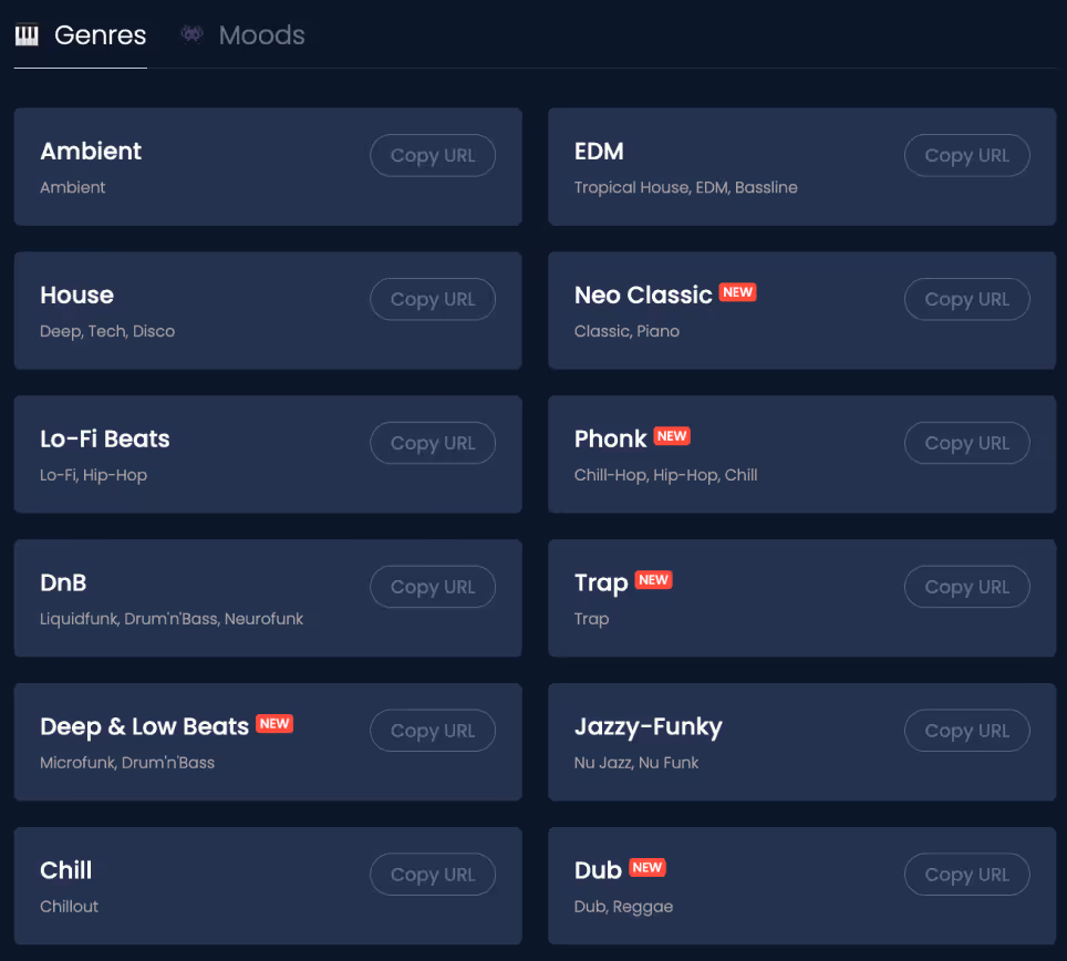 Choose from 12 unique genres and moods to match your stream's energy, from chill beats to high-energy rhythms. Tailor the music to your stream's vibe with Mubert for a perfect fit every time.